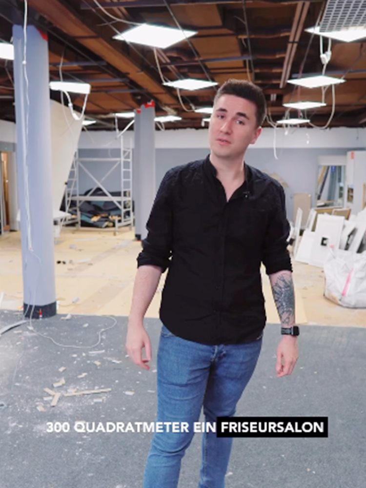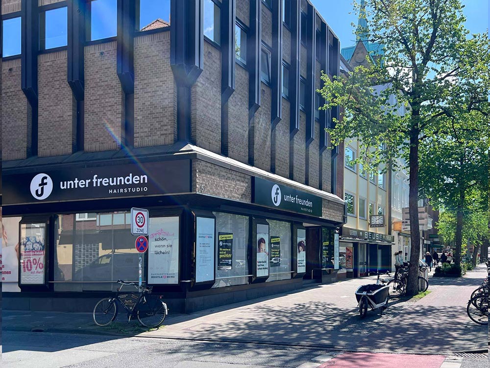 Doch jetzt bringt Friseurmeister Canel Yalcin den Glamour zurück. Mit seinem Studio „Unter Freunden“ wechselt er im Sommer 2026 von der Wolbecker Straße hierher. Schon bei unserem ersten Besichtigungstermin war Canel begeistert von der lebendigen Atmosphäre, dem guten Umfeld und der hohen Frequenz und Sichtbarkeit an der Hammer Straße – und der Innungsmeister hatte sofort eine klare Vision für die rund 300 Quadratmeter große Fläche: das Erdgeschoss des ehemaligen Modehauses ins vermutlich größte Hair-Studio – nein: Hair-Loft! – der Stadt zu verwandeln.